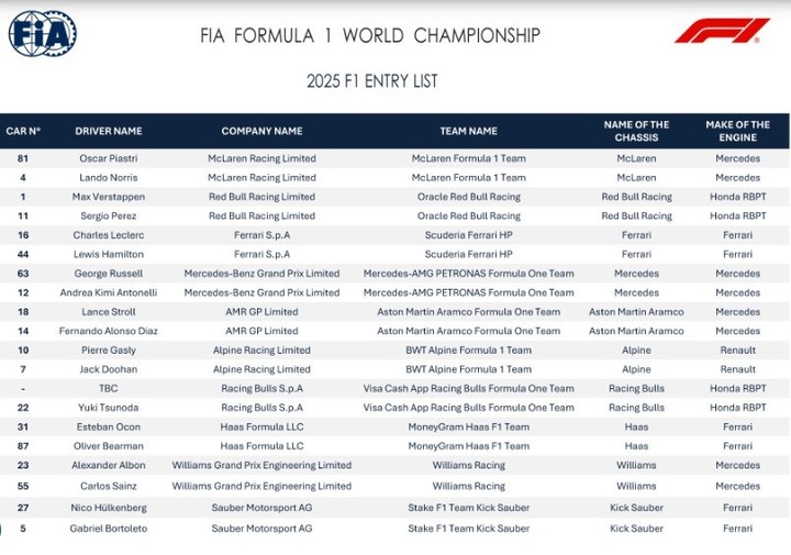 En el listado de inscriptos que la FIA publicó en su sitio web, confeccionado a partir de la información suministrada por las escuderías, no hay sorpresa alguna. Allí aparece Sergio Pérez como compañero del campeón Max Verstappen en Red Bull, pese a que arrecian los rumores sobre su salida del equipo de Milton Keynes.