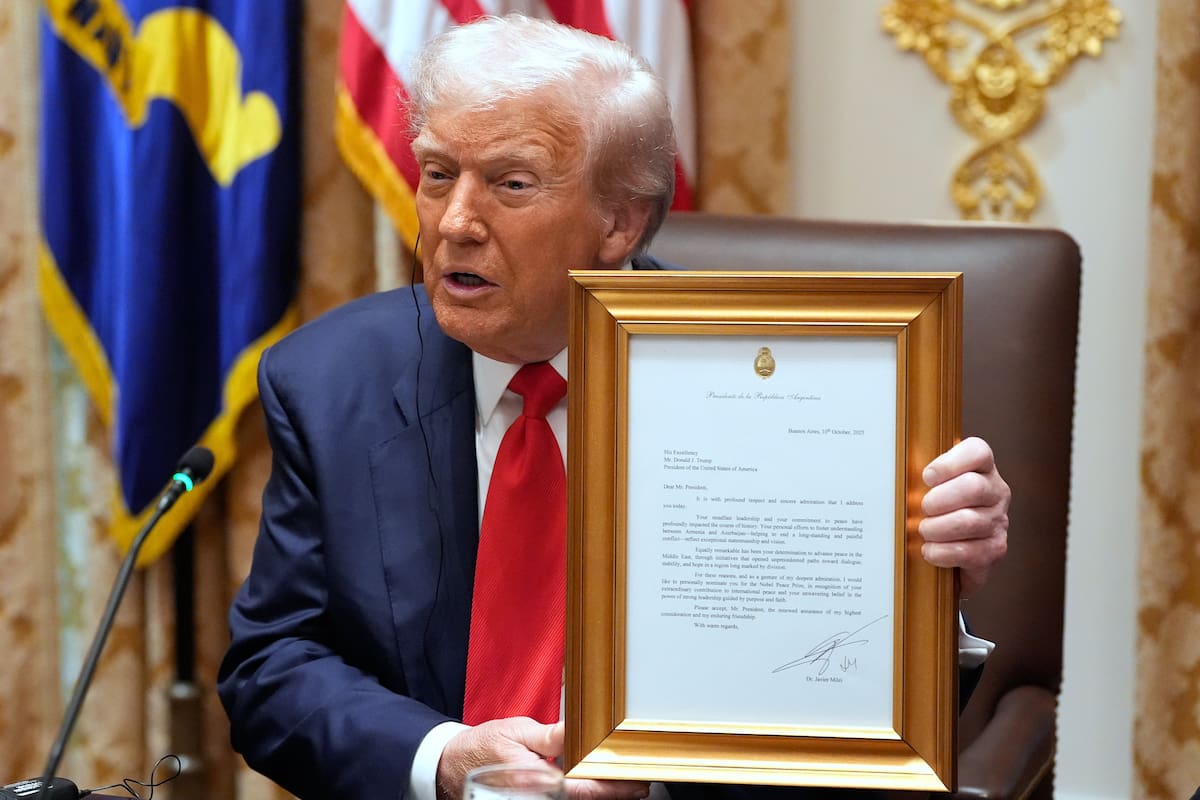 WASHINGTON.- El presidente argentino, Javier Milei, le entregó el martes una carta de agradecimiento al presidente norteamericano, Donald Trump, firmada por las familias de los rehenes argentinos liberados en Israel el lunes, en el marco de una visita de Estado del mandatario argentino.