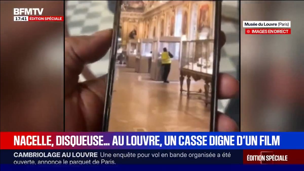 Un video difundo en redes muestra a uno de los presuntos ladrones, vestido con un chaleco amarillo de los trabajadores de la alcaldía de París, rompiendo una vitrina en la galería de Apolo del museo, donde se exhiben gemas y joyas de la corona de Francia. Se trata de una pieza audiovisual difundida por el canal de noticias local BFMTV que mostró imágenes de este hombre forzando la vitrina mientras al fondo se ve a la gente corriendo durante la evacuación. Por el hecho, las autoridades dispusieron el cierre del museo por 24 horas mientras avanza la investigación.