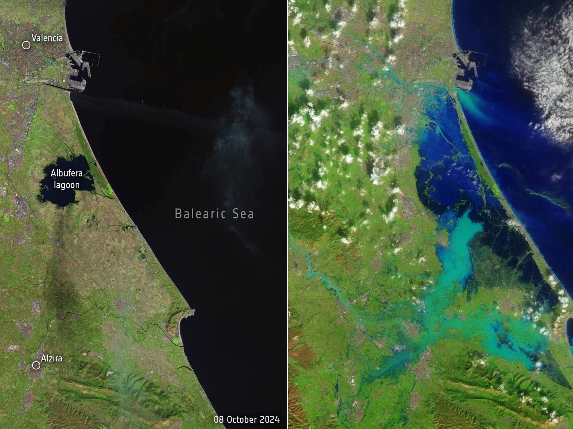 Ríos y ramblas desbordadas, municipios inundados… Destrucción. Las imágenes distribuidas por la Agencia Espacial Europea muestran el antes y el después de la tragedia tras el paso de la DANA por la provincia de Valencia. Son imágenes del satélite estadounidense Landsat-8 que ilustran vívidamente la magnitud del desastre, con imágenes del 8 y el 30 de octubre que muestran la dramática transformación del paisaje.